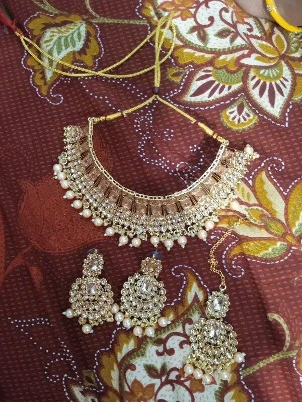 ✨ Royal Gold-Plated Bridal Choker Necklace Set with Earrings & Maang Tikka – Elegant Kundan & Pearl Design