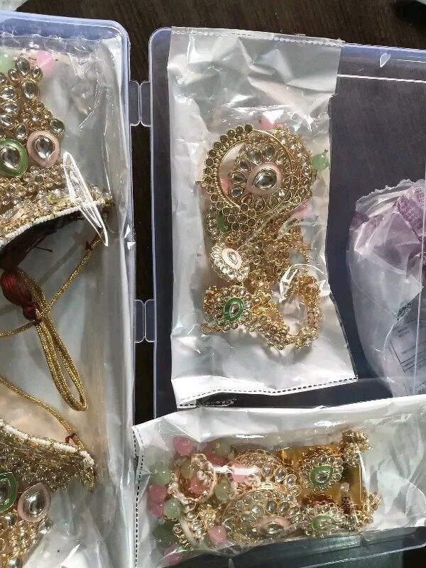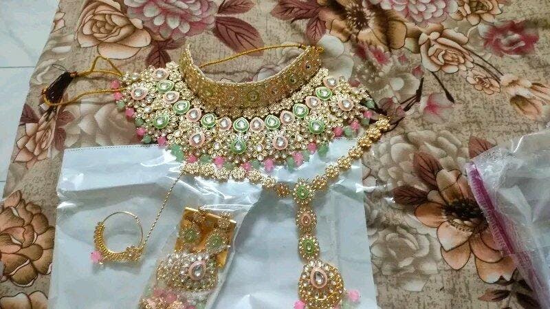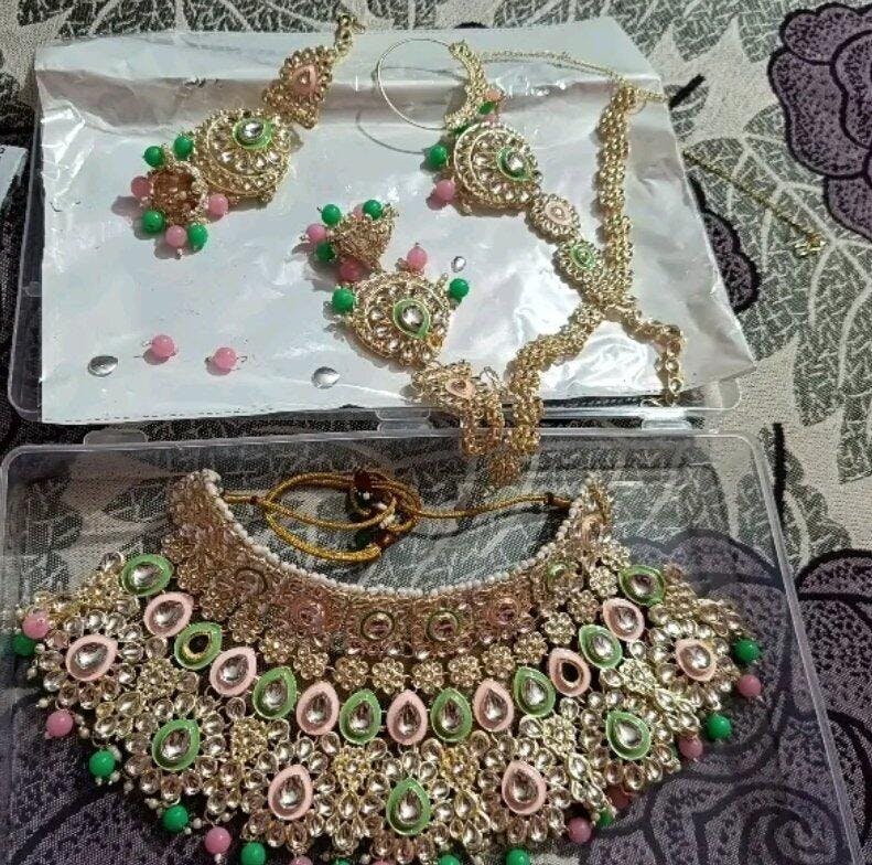 The complete set includes a heavy choker necklace, long necklace, statement earrings, maang tikka, and hand bracelet, each piece handcrafted with intricate detailing for a truly grand finish.