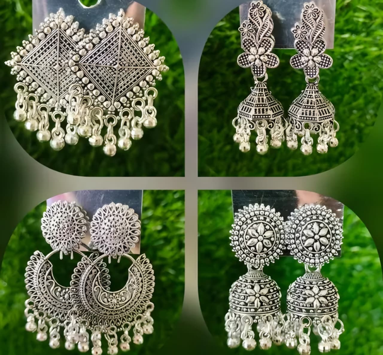 4-Combo Silver Oxidised Design Earrings For Women & Girls.