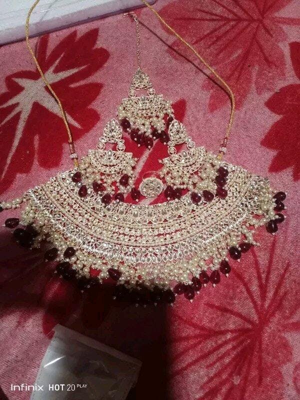 - Rich Ruby Drops: A stunning fringe of deep ruby-red tear-drop beads adorns the base of the choker, the earrings, and the maang tikka. This vibrant color contrast adds a layer of richness and traditional elegance to the overall design.