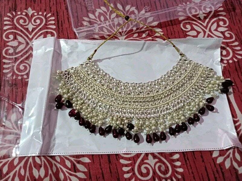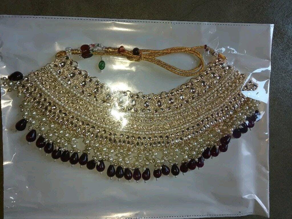 - Brilliant White Stones: The expansive, intricate choker necklace is blanketed in high-quality, brilliant-cut rhinestones (often referred to as American Diamonds or polki-style cut stones). This dense setting creates an incredible, continuous sparkle that mimics the fire of real diamonds.