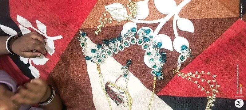 Turn heads with this stunning bridal jewelry set, beautifully designed with shimmering green stones, dazzling crystals, and delicate pearl chains. This complete set includes a statement necklace, matching long earrings, and a maang tikka – perfect for weddings, parties, and festive occasions.