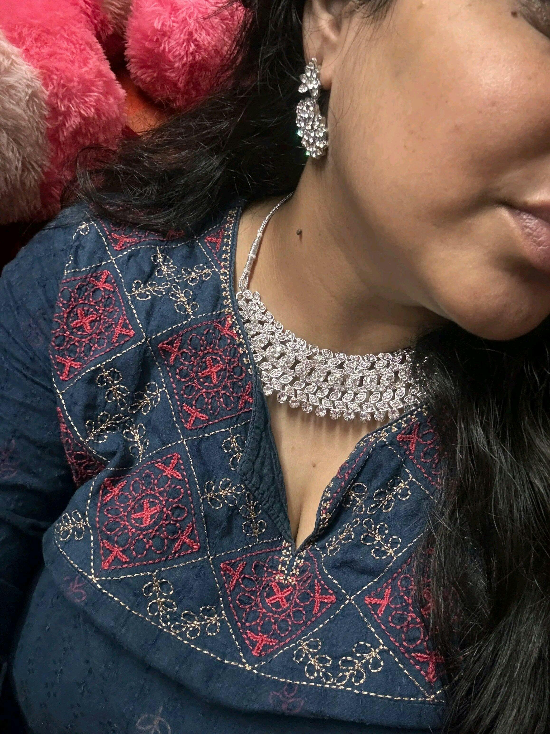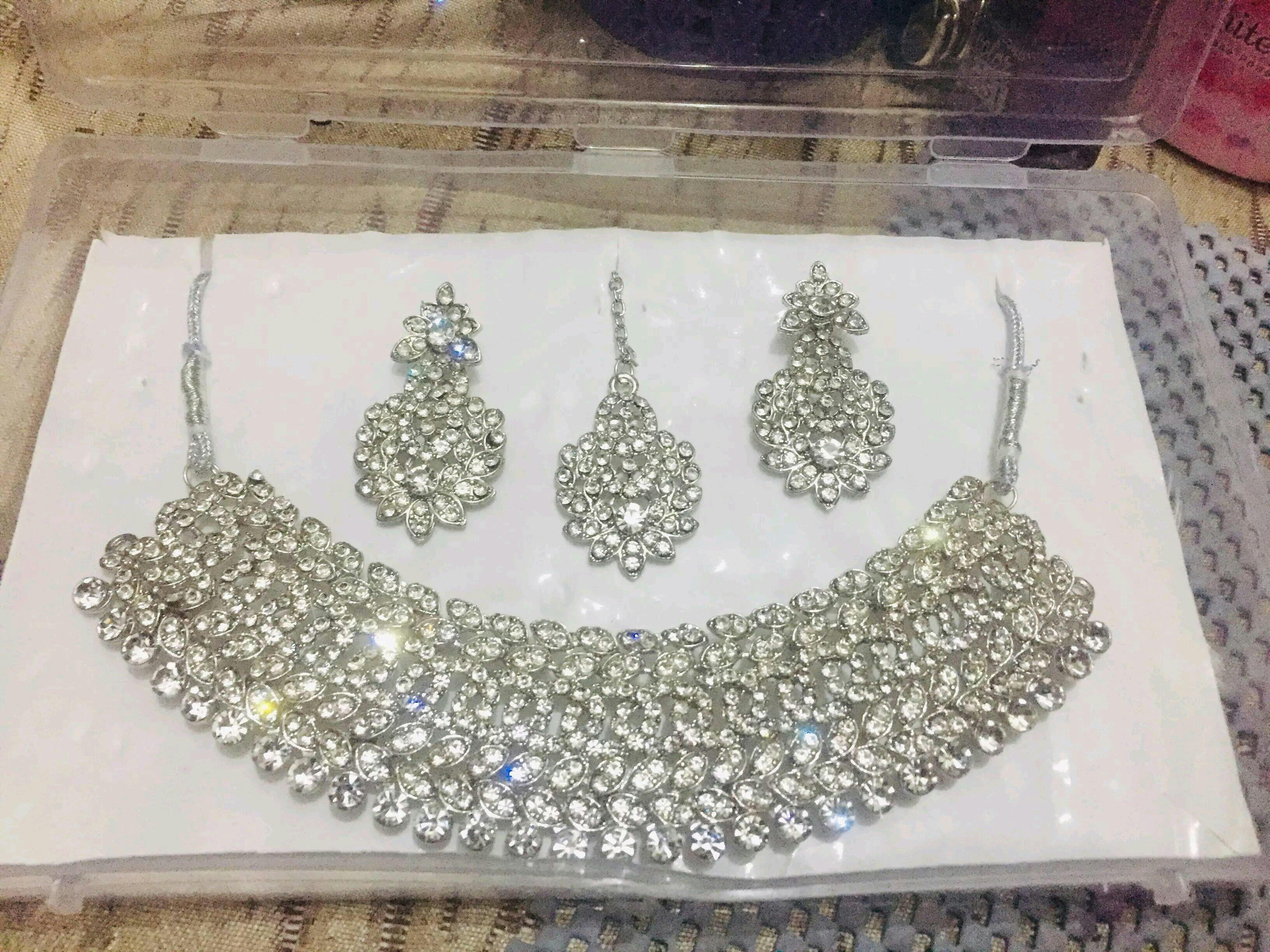 ✨ Choker Necklace – A bold and elaborate wide choker design, embellished with shimmering white stones and floral motifs, perfect for a royal bridal style.