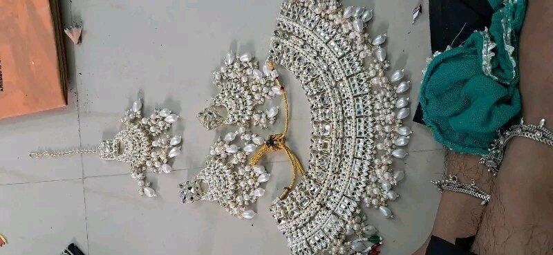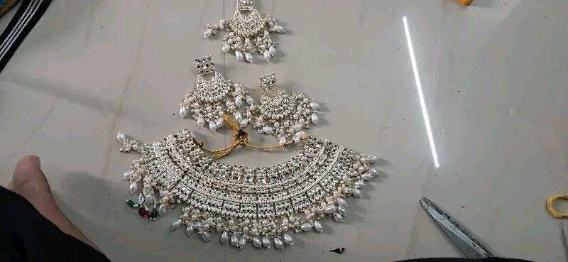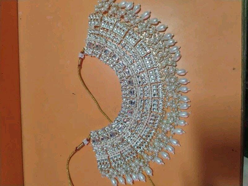 - Heavy Chandbali Earrings: The accompanying earrings are enormous chandbali (crescent moon) style chandeliers, fully embellished with the same sparkling stones and heavy pearl drops, ensuring a cohesive and incredibly dramatic look.
