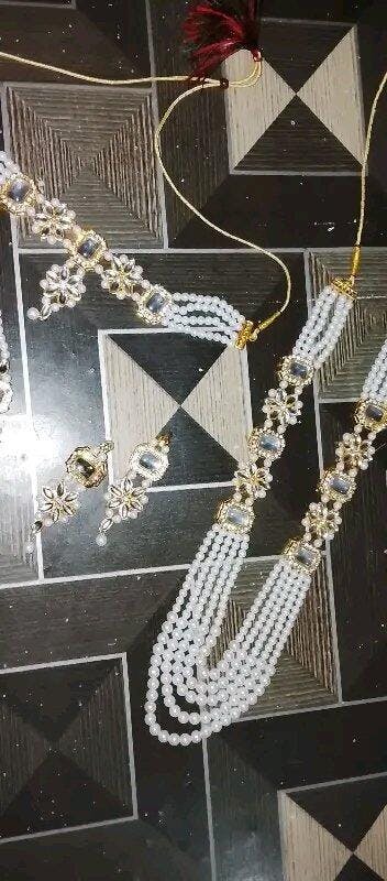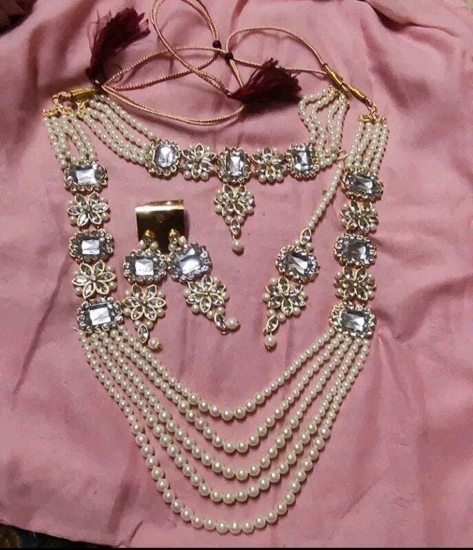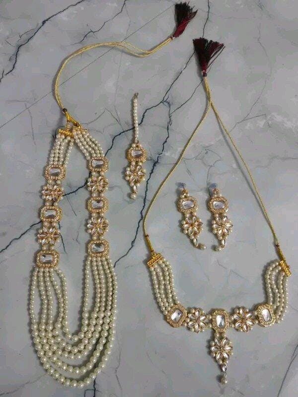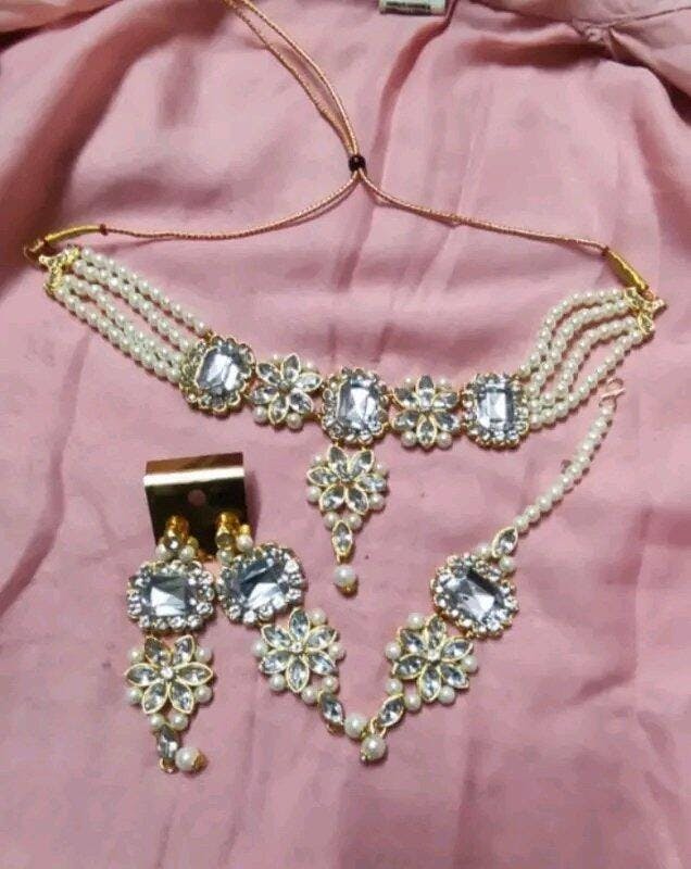 Elevate your bridal or festive look with this exquisite pearl and crystal polki jewelry set, crafted to perfection for timeless elegance. The set features: