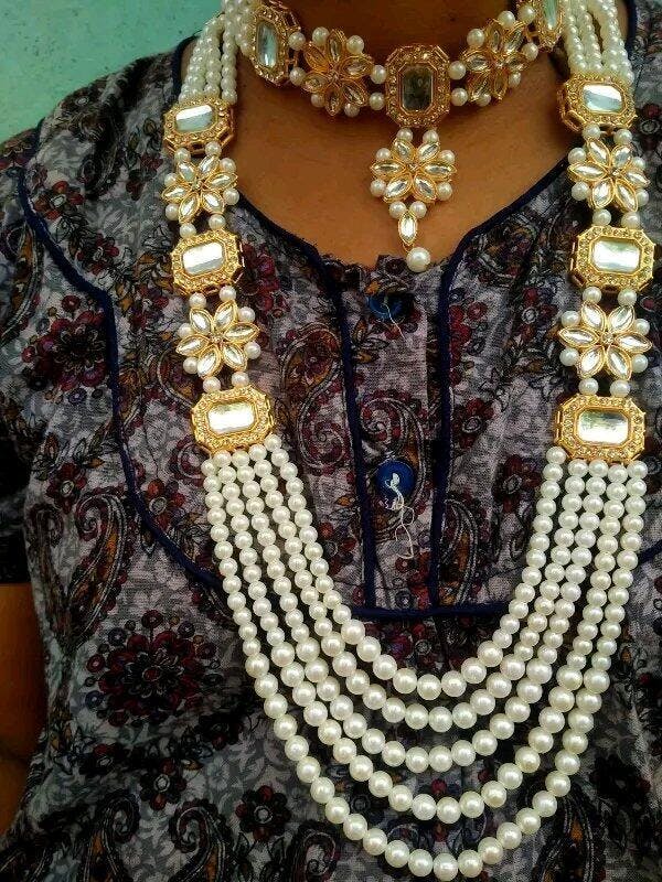 ✨ Long Layered Mala – A statement multi-strand pearl mala embellished with dazzling rectangular crystals and floral polki accents, perfect for pairing with traditional and contemporary outfits.