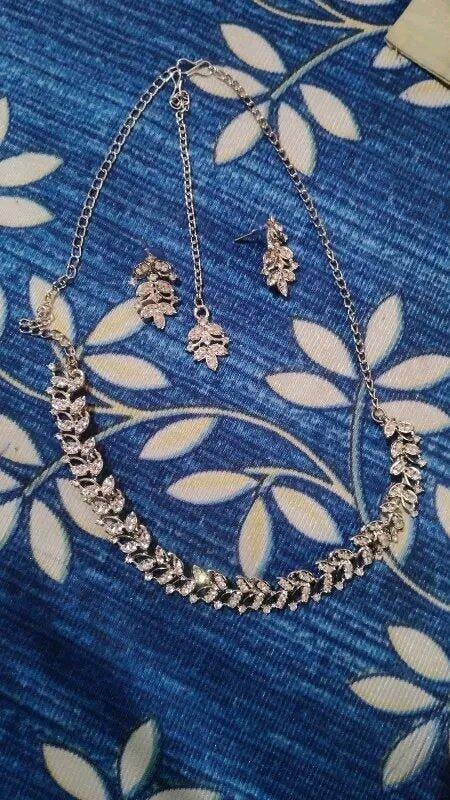 Graceful Leaf Set: A delicate yet elegant necklace inspired by leaf motifs, adorned with sparkling stones and paired with coordinated earrings and maang tikka. Perfect for engagements, parties, and festive wear.